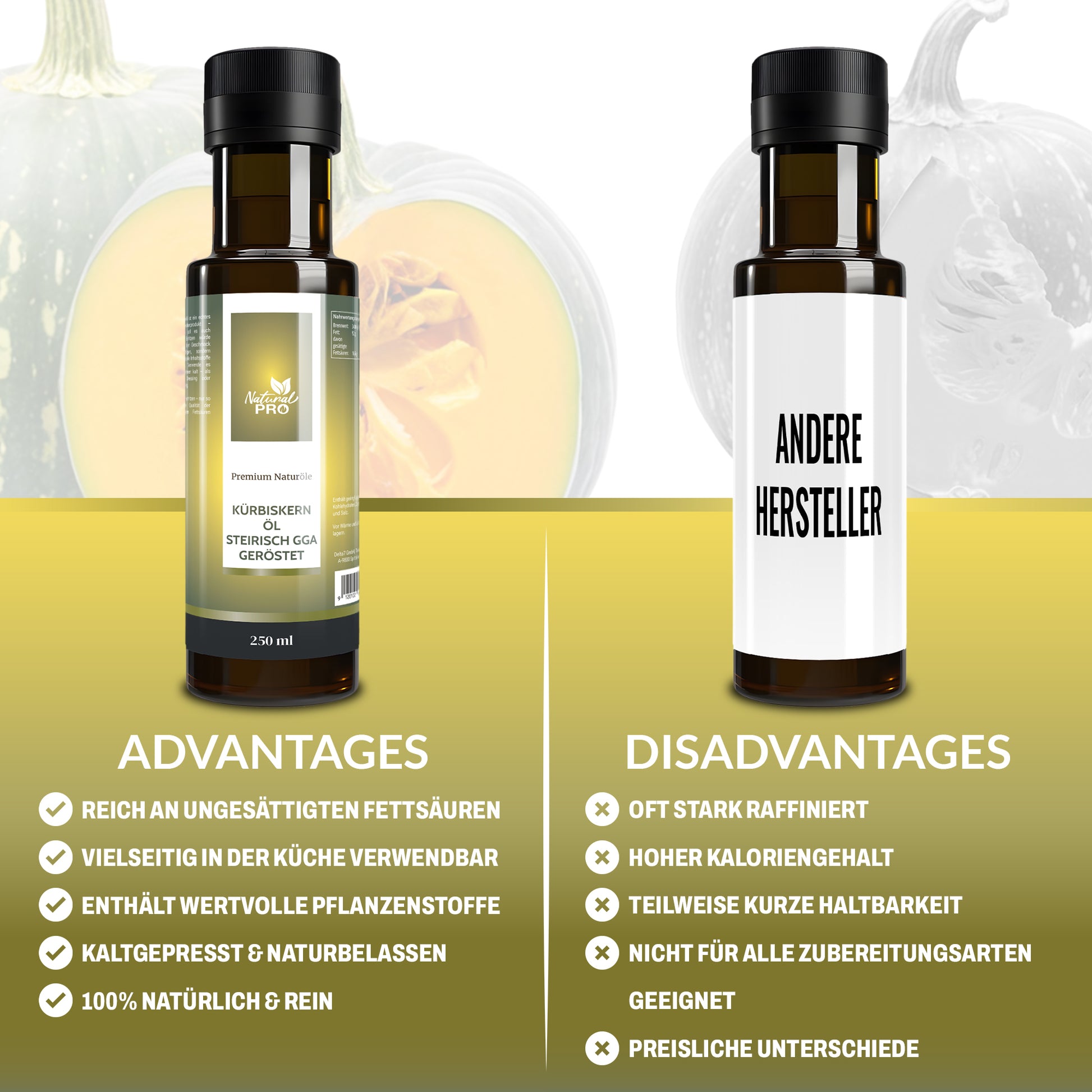 Wenn Du den Geschmack deiner Küche auf ein neues Level heben willst, dann ist das steirisch geröstete Kürbiskernöl von Natural Pro genau das Richtige für Dich. Das Öl überzeugt mit einem intensiven, nussig-würzigen Aroma und einer tiefgrünen Farbe – perfekt für Feinschmecker, Hobbyköche und alle, die gerne mit hochwertigen Zutaten arbeiten.