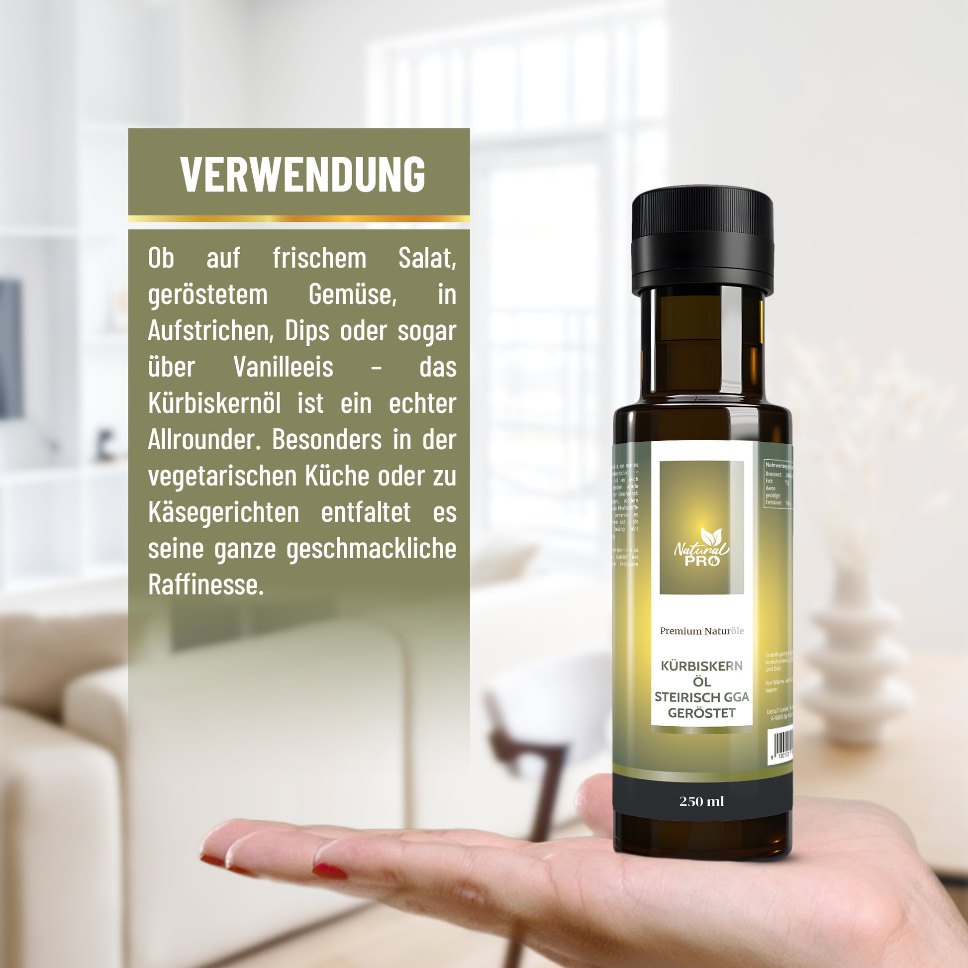 Ob auf frischem Salat, geröstetem Gemüse, in Aufstrichen, Dips oder sogar über Vanilleeis – das Kürbiskernöl ist ein echter Allrounder. Besonders in der vegetarischen Küche oder zu Käsegerichten entfaltet es seine ganze geschmackliche Raffinesse.