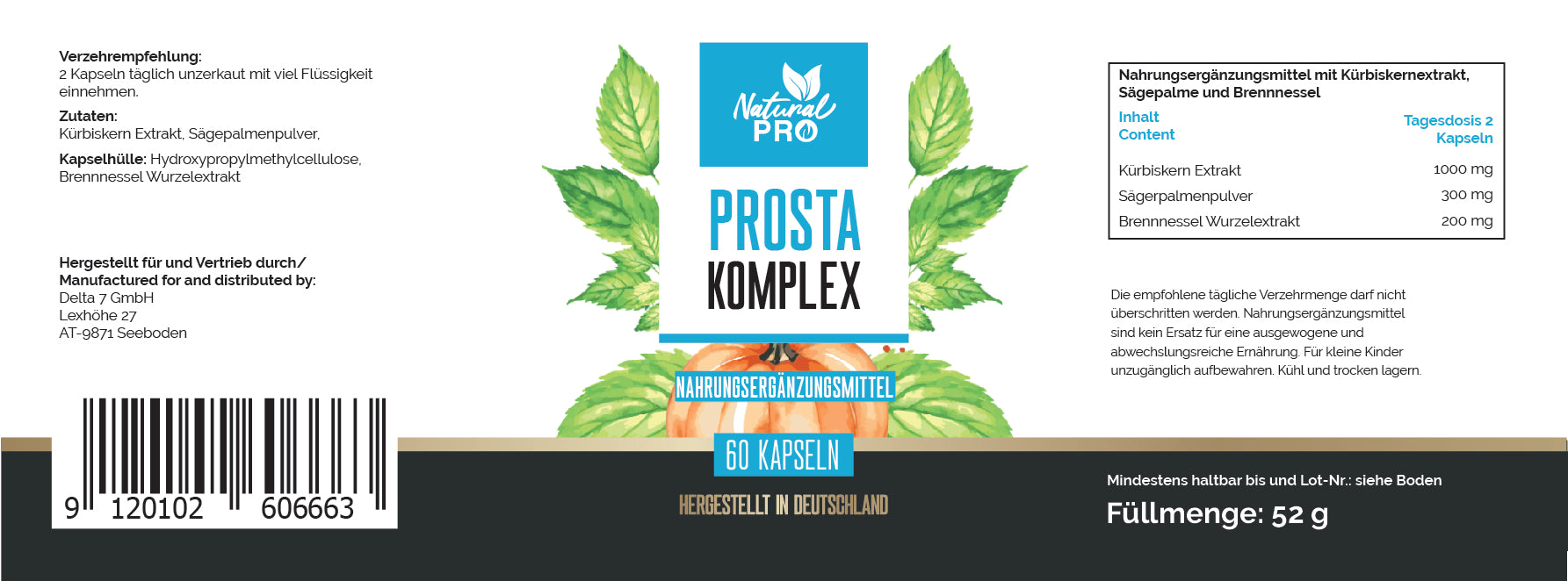 Kürbiskern Extrakt, Sägepalmenpulver, Kapselhülle: Hydroxypropylmethylcellulose, Brennnessel Wurzelextrakt