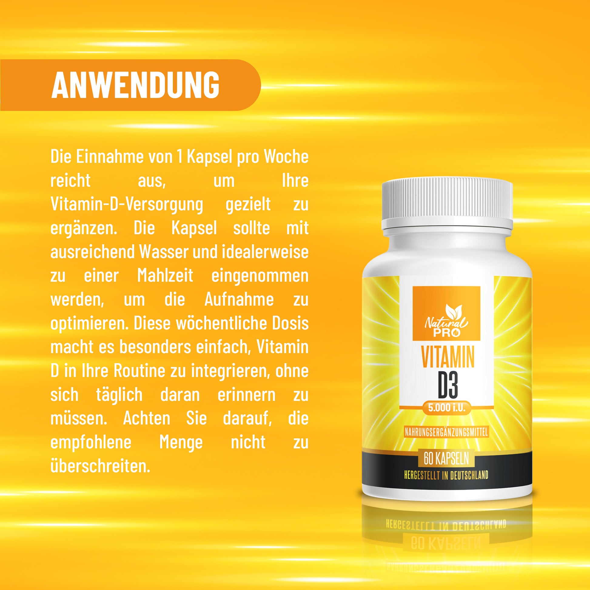 Wussten Sie, dass Ihr Körper Vitamin D3 mit Hilfe von Sonnenlicht selbst produzieren kann? Doch gerade in den dunklen Monaten oder bei einem Lebensstil mit wenig Sonnenexposition kann eine ausreichende Versorgung zur Herausforderung werden. Genau hier kommt unser Natural Pro - Vitamin D ins Spiel. Mit einer umfassenden Dosis von 5.000 i.U., trägt es zur normalen Funktion des Immunsystems sowie zur Erhaltung normaler Knochen und Muskeln bei – Tag für Tag!